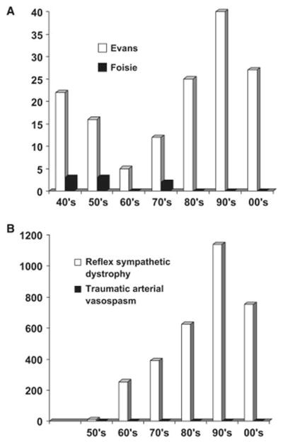 What Evans termed Reflex Sympathetic Dystrophy, Foisie called Traumatic Arterial Vasospasm.38, 40, 1 While both hypotheses included the sympathetic nervous system and vasospasms and ischemia and both recommended sympathetic nerve blocks as treatment, it was their views of centrality of the sympathetic system to the condition that differed.38, 1 In Evan’s proposal, the sympathetic system’s abnormally increased activity was foundational and critical to maintain the vicious circle of the condition.38, 1 In Foisie’s proposal, the injury itself induced the vasospasm, and so increased sympathetic activity could occur but was not required.38, 1
